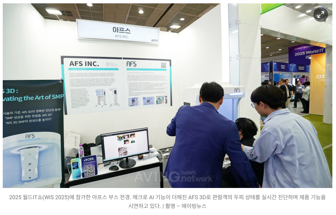 인공지능(AI) 기반 탈모 진단 장비 AFS 3D가 한 단계 더 진화했다. 스타트업 아프스(대표 김태희)는 4월 24일부터 26일까지 서울 코엑스에서 열리는 ‘2025 월드IT쇼(WIS)’에 참가해 AFS 3D의 최신 기술 업데이트를 공개하고 현장 시연에 나섰다.