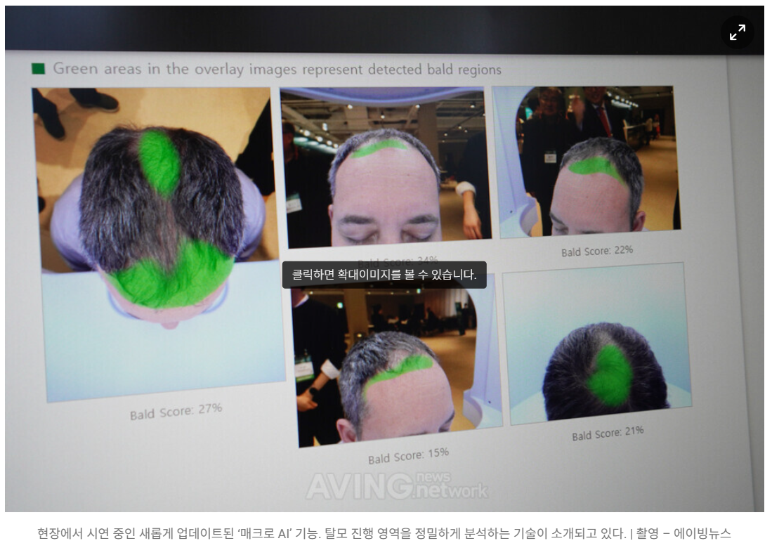 이번에 아프스가 공개한 핵심 업데이트는 ‘매크로 AI’ 기능이다. 기존에는 모발의 굵기, 밀도, 모낭 상태 등을 중심으로 한 ‘마이크로 AI’ 분석이 주를 이뤘다면, 이번에는 탈모 진행 면적을 정량화해 분석할 수 있는 ‘매크로 AI’ 기능이 추가됐다. 이를 통해 두피 위 탈모 영역에 대한 보다 정밀한 진단이 가능해졌다.